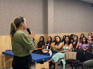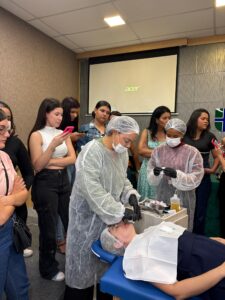 A oficina “Preenchimento Labial – Farmácia Estética com Responsabilidade”, conduzida por Laís Cristina Herculano Cardoso, foi um dos pontos altos do evento. Durante a atividade, Laís realizou um preenchimento labial ao vivo na professora Suelolen Medeiros, demonstrando na prática as técnicas, cuidados e protocolos necessários para um procedimento seguro, ético e responsável na área da estética farmacêutica.